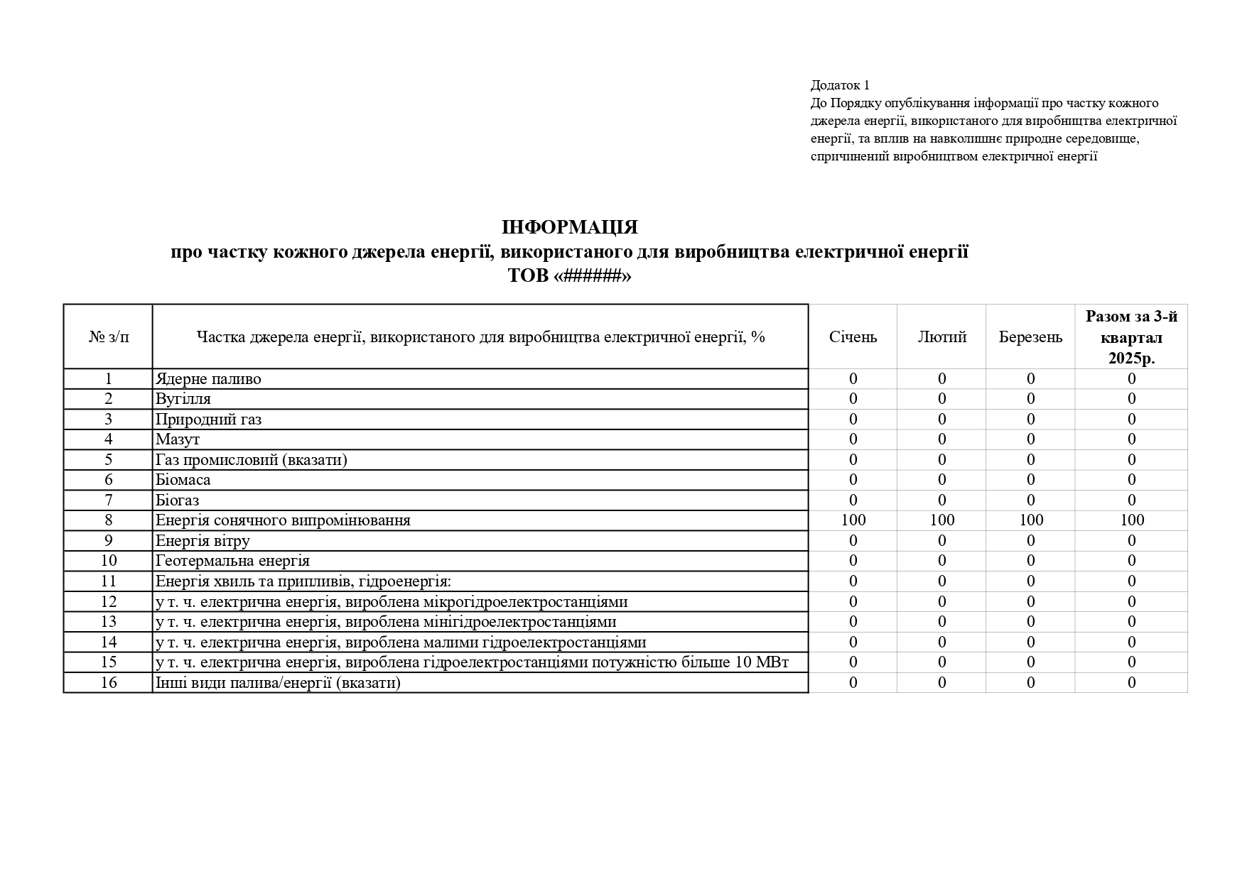 Частка кожного джерела енергії ТОВ "######" за ІIІ квартал 2025р