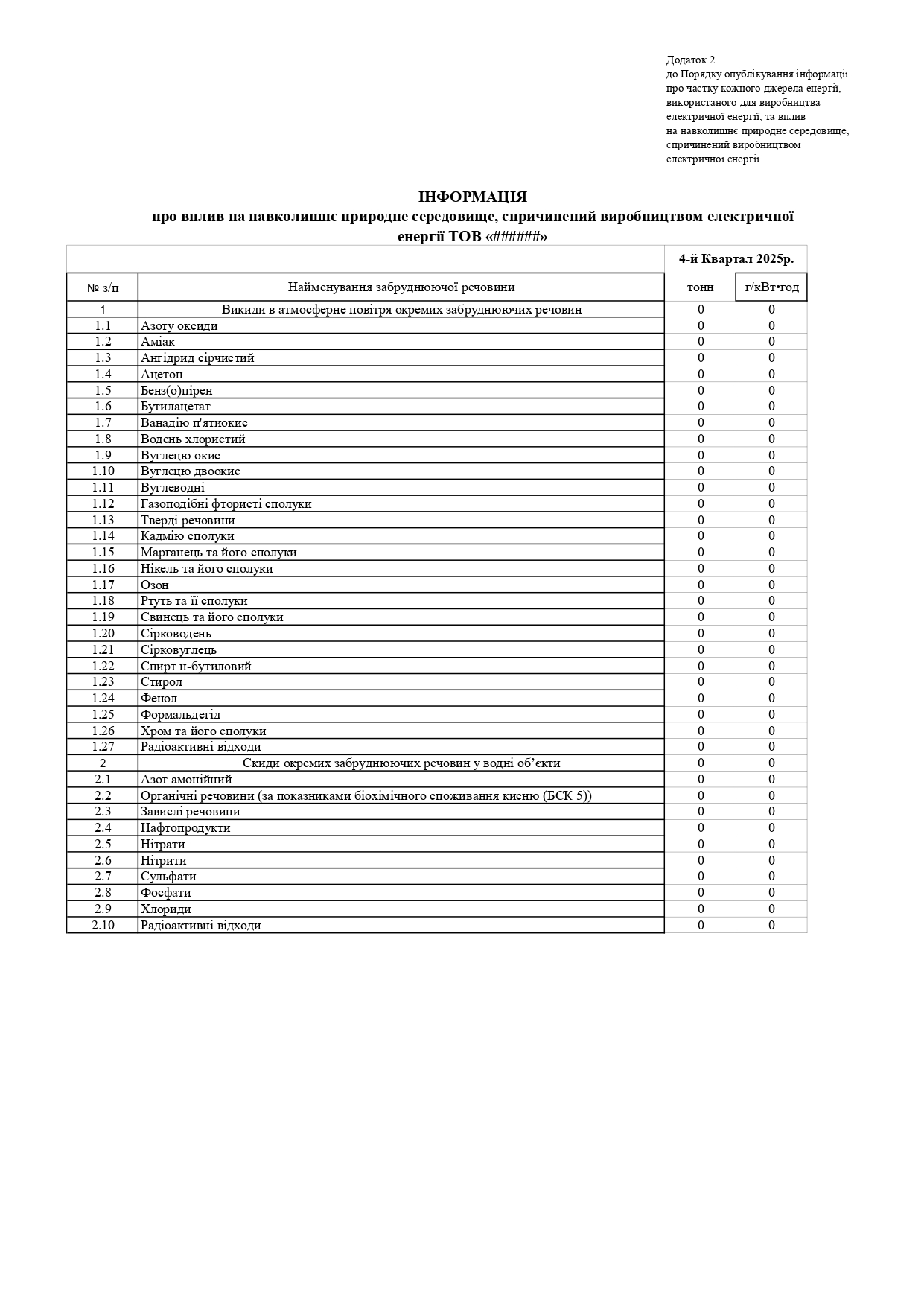 Вплив на навколишнє середовище ТОВ "######" за ІV квартал 2025р